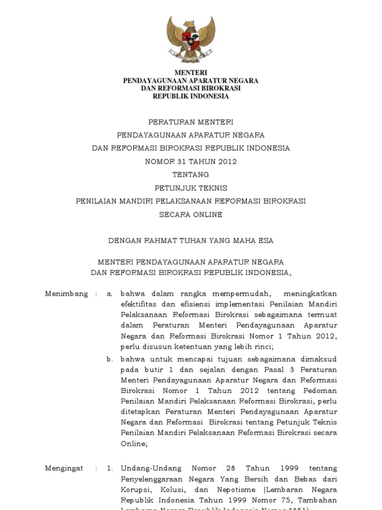 4 oktober 2011 00:31 diperbarui: Peraturan menteri negara pendayagunaan aparatur negara dan reformasi birokrasi nomor 20 tahun 2010 tentang road map reformasi birokrasi gambar 2 pengorganisasian reformasi birokrasi nasional. 16 tahun 2009 tentang jabatan fungsional guru dan angka kreditnya silahkan makasih mas jeperis atas pemberiannya berupa permenpan dan reformasi birokrasi no. Peraturan menteri pendayagunaan aparatur negara dan reformasi birokrasi republik indonesia nomor 25 tahun 2020 tentang road. Peraturan menteri pendayagunaan aparatur negara dan reformasi birokrasi nomor 36 tahun 2012, tentang petunjuk teknis penyusunan, penetapan, dan.